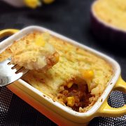 土豆泥、肉末、西红柿、玉米粒、洋葱、油、盐、料酒、老抽、胡椒粉、番茄酱、牛奶。