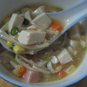 豆腐、肉末、金针菇、玉米粒、胡萝卜、火腿、葱。