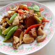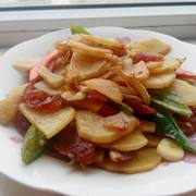 腊肠、土豆、胡萝卜、辣椒、葱、姜、蒜、食用油、老抽、盐、醋、鸡精。