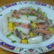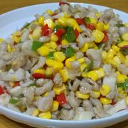 去骨去皮兔肉、甜玉米罐头、红甜椒、青甜椒、盐、糖、老姜、红薯水淀粉、玉米油、味精。