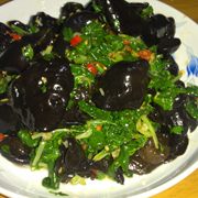 水发黑木耳、芹菜叶、小红辣椒、老姜、盐、糖、色拉油、味精、生抽。