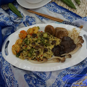 米饭、秋葵、松菇、杏鲍菇、真姬菇、金针菇、虾、红尖椒、胡萝卜、橄榄油、咖喱粉、盐、干罗勒叶、干迷迭香叶。