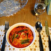 鲜虾、草菇、圣女果、椰奶、柠檬、冬阴功酱、泰椒、姜、盐、蔬菜粉、细叶葱。
