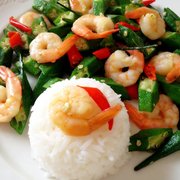 秋葵、虾仁、泰椒、蔬菜粉、葱、蒜末。