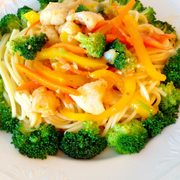彩椒、鳕鱼、意面、西兰花、胡萝卜、西红柿、葱、蔬菜粉、番茄酱。