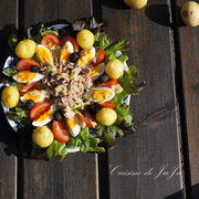 生菜叶、番茄、鸡蛋、金枪鱼、黑橄榄、土豆、第戎黄芥末、醋、橄榄油、盐、胡椒。