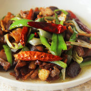 鸡杂、鸡皮、青椒、姜丝、蒜、红辣椒、蒜叶、米酒、生抽、盐巴、鸡精。