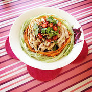 鸡肉、黄瓜、胡萝卜、花椒粒、红辣椒、大蒜、香菜、生抽、白糖、香醋、料酒、香油。