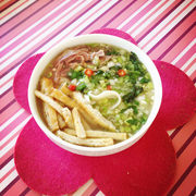 面条、豆腐、鸡丝、鸡汤、香菜、蒜苗、盐、味精。