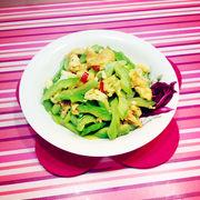 苦瓜、鸡蛋、料酒、小米椒、盐、鸡精。