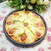发面团、烤肠、洋葱、辣椒、芝士、披萨草、披萨酱。