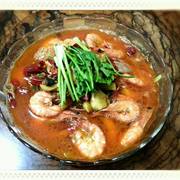 鲜虾、芹菜、红薯粉、葱、姜、蒜、干辣椒、花椒粒、香辣酱、火锅底料、料酒、老抽、白糖、鸡精、香菜。