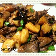 土鸡、土豆、葱、姜、蒜、青椒、干红椒、花椒粒、香辣酱、料酒、盐、鸡精。