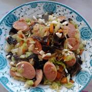 白菜、木耳、肉花肠、胡萝卜、葱,蒜、豆油,酱油,精盐、味精,花椒。
