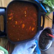 土鸡1只、土豆、青菜、虾子、花菜、胖子火锅底料、生姜、大葱。