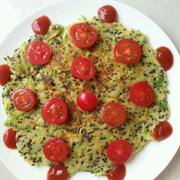 小西葫、鸡蛋、面粉、樱桃番茄、香葱、黑芝麻、盐、番茄沙司。