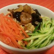 五花肉片、木耳、黄花菜、鸡蛋、虾仁、黄瓜、胡萝卜、口蘑、手擀面、葱、盐、鸡精、糖、酱油、淀粉、料酒。