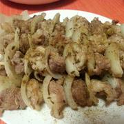 羊腿肉、洋葱、盐、糖、酱油、料酒、孜然。