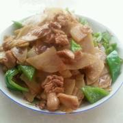 五花肉片、青椒、土豆、盐、糖、酱油、鸡精、葱。
