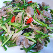 牛里脊肉、蒜苗、杏鲍菇、木耳、盐、牛肉粉、酱油、姜丝。