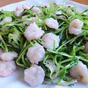 豌豆苗、虾仁、蛋清、淀粉、酒、盐、油、胡椒粉、麻油。