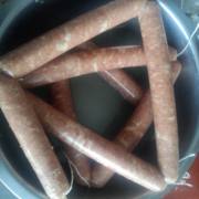 猪肉、鸡腿、肠皮、花椒粉、姜、大蒜、盐、淀粉、料酒。