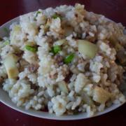 剩米饭、洋葱、猪肉、水、油、葱、盐、酱油、花椒粉。