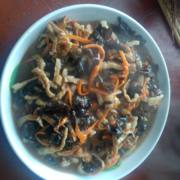 猪瘦肉、木耳、胡萝卜、淀粉、葱、清水、盐、糖、醋、酱油、老抽、花椒粉。