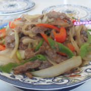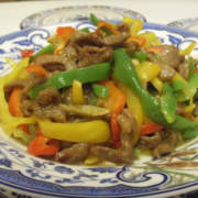 牛里脊肉、绿麻椒、红彩椒、黄彩椒、盐、料酒、生抽、玉米淀粉、葱、姜。