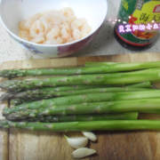 芦笋、虾仁、蒜瓣、蚝油、料酒、盐、玉米淀粉。