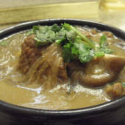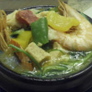 冻豆腐、魔芋、大虾、腊肠、杭椒、鱿鱼片、彩椒、香菜、浓汤宝、盐、麻油、辣椒油、香油。