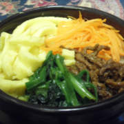 米饭、菠菜、胡萝卜、鸡蛋、瘦肉、自制辣椒、韩式辣椒、面粉、甜面酱、盐、鸡精、生抽。