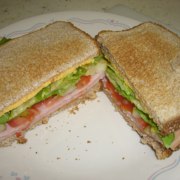火腿肉、面包、西红柿、生菜叶、奶酪。