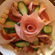 生菜、西红柿、面包、小黄瓜、火腿片、丘比特培根芝麻酱。