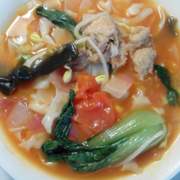 刀削面、亨氏番茄酱、西红柿、洋葱、小青菜、葱姜蒜、海带、豆芽。
