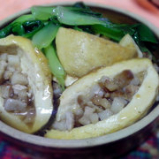 卤肉、豆干、青菜、盐、鸡粉、生粉、酱油、食用油。