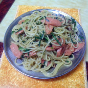 直条意大利面、泡面味火腿肠、小荞头菜、蒜末、盐、鸡粉、蚝油、酱油。