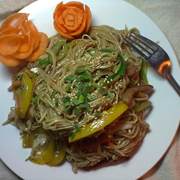 面条、猪肉、胡萝卜、大葱、青椒、黄椒、姜、蒜、盐、酱油、淀粉、味精、花椒粉、芝麻、油、香油、葱花。