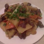 牛肉、土豆、胡萝卜、大葱、姜、油、盐、花椒、酱油、香料、香油、味精、料酒、葱花、糖。