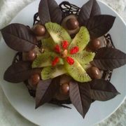 戚风蛋糕、黑巧克力、白巧克力、咖啡豆、猕猴桃、杏仁、枸杞、树叶。