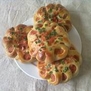 面粉、火腿、水、鸡蛋、黄油、糖、盐、酵母粉、葱花、蛋液。