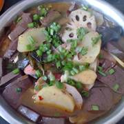 血旺、莴笋、土豆、黄豆芽、莲藕、平菇、火腿、木耳、海带、大葱、姜、花椒、蒜、干辣椒、蒜苗、油、盐、鸡精、葱花、豆瓣。
