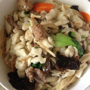 面粉、猪骨汤、泡发木耳、泡发腐竹、小青菜、胡萝卜、金针菇、过油豆腐、粉丝、过油肉、炸丸子、蒜苗末、香菜末、盐、味精、香油。