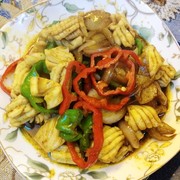 鱿鱼、青椒、红椒、孜然粉、盐、味精、糖、胡椒粉、生抽。