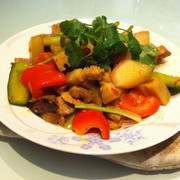 五花肉、藕、黄瓜、青椒、红椒、红皮萝卜、芹菜、二荆条、干辣椒、姜、葱、蒜、泡红椒、香菜。