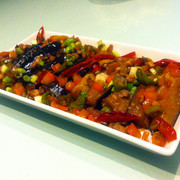 茄子、甜红椒、二荆条、姜、蒜、小葱、干辣椒、生抽、醋、白糖、鸡汁、盐。