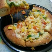 高筋粉、温水、奶酪、黄油、盐、糖、酵母、青椒,玉米粒,香肠,圣女果,腌过的奥尔良鸡胸肉,、披萨酱。