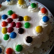6寸心性戚风蛋糕、淡奶油、mm糖豆、鸡蛋、低筋粉、玉米淀粉、牛奶、食用油、火龙果、糖、糖(入奶油)。