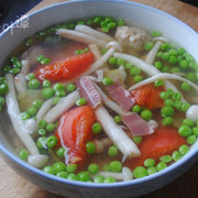 豌豆、蘑菇、番茄、自制贡丸、火腿片、猪腿肉、榨菜、盐、味精。