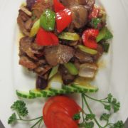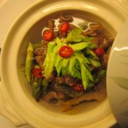 羊肉、红椒、上海青、西芹、白葡萄酒、生姜、味精、生粉、食用油、美极酱油、盐。